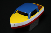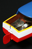 右端にメカ部分の拡大写真を入れたけど、中のついたてみたいなのが、見た目かっちりしていても学研ボートでは水が浸入した役に立たなかった部品。(こっちでは船体の中に入れてしまってエンジン部分の固定に使っているだけなので大丈夫だけど。)