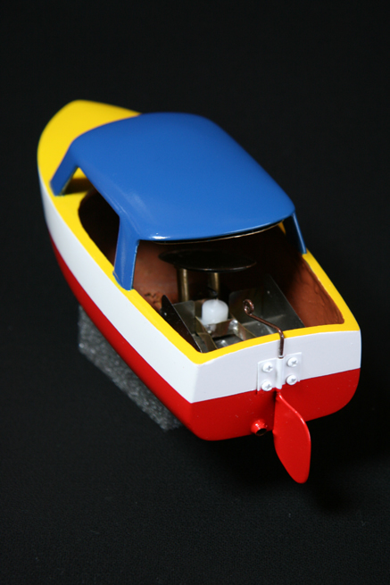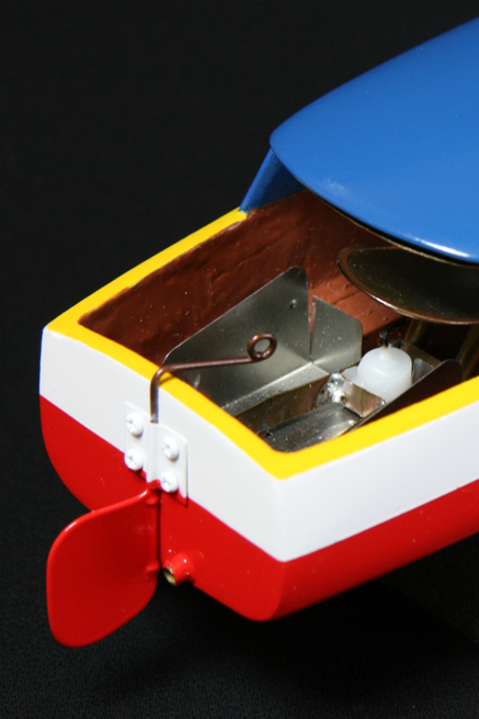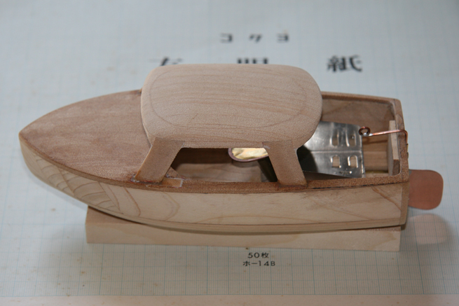 舵は銅線と銅板でらしくないほどがっちりしたヤツを作ったけれど、これ市販のボートの舵によくあるけど舵面が船体より下に出ていないのが多く、舵を曲げても全然曲がらないオモチャが多い。(780円のポンポン船もそうなってる。)